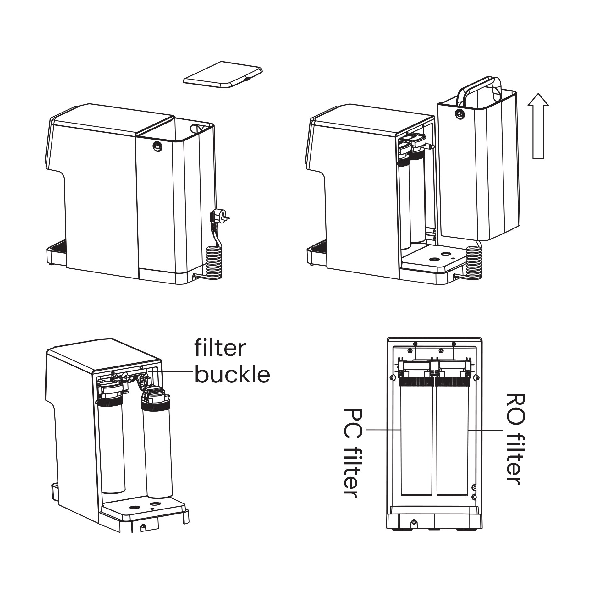 Nehmen Sie den Deckel des Rohwasserbehälters ab, heben Sie den Behälter an und lösen Sie das Band des Ersatzfilters. Setzen Sie den neuen Filter ein, achten Sie auf die korrekte Platzierung und ziehen Sie das Band wieder fest.